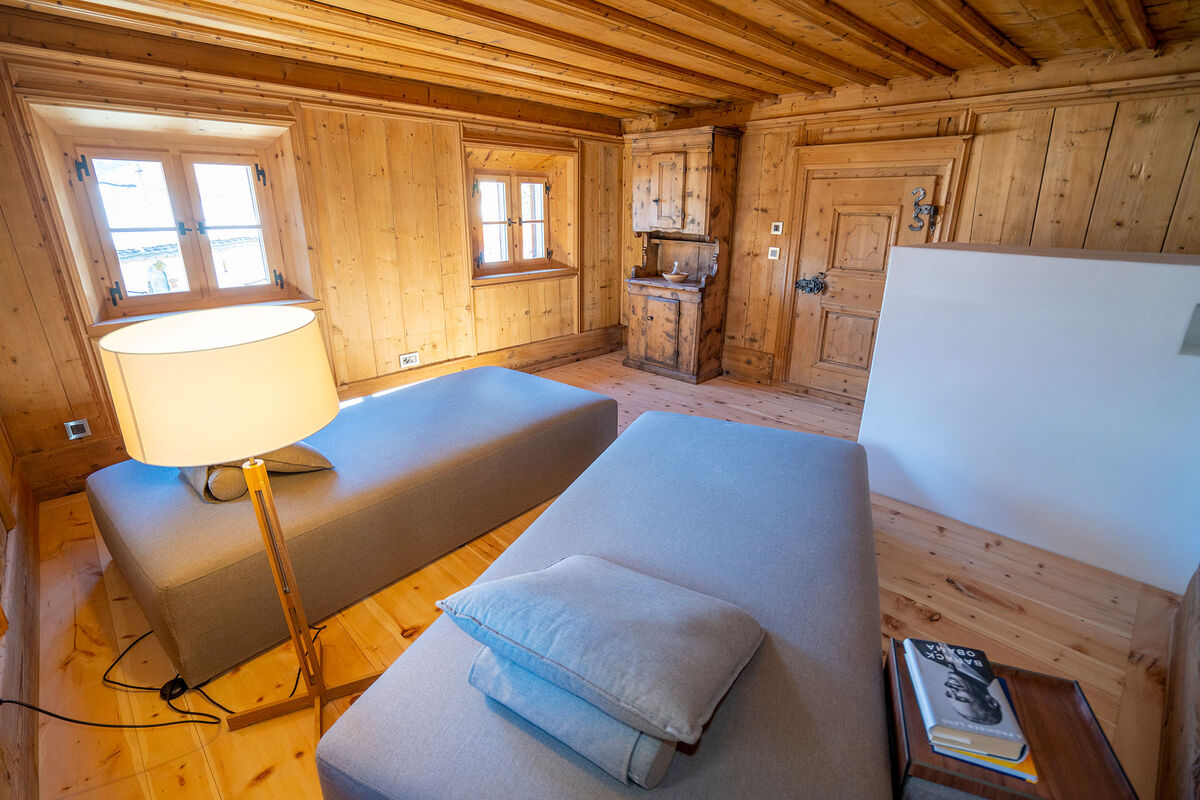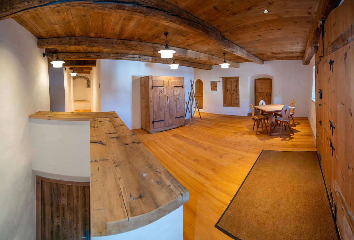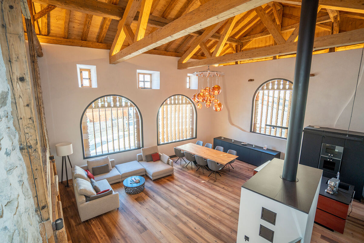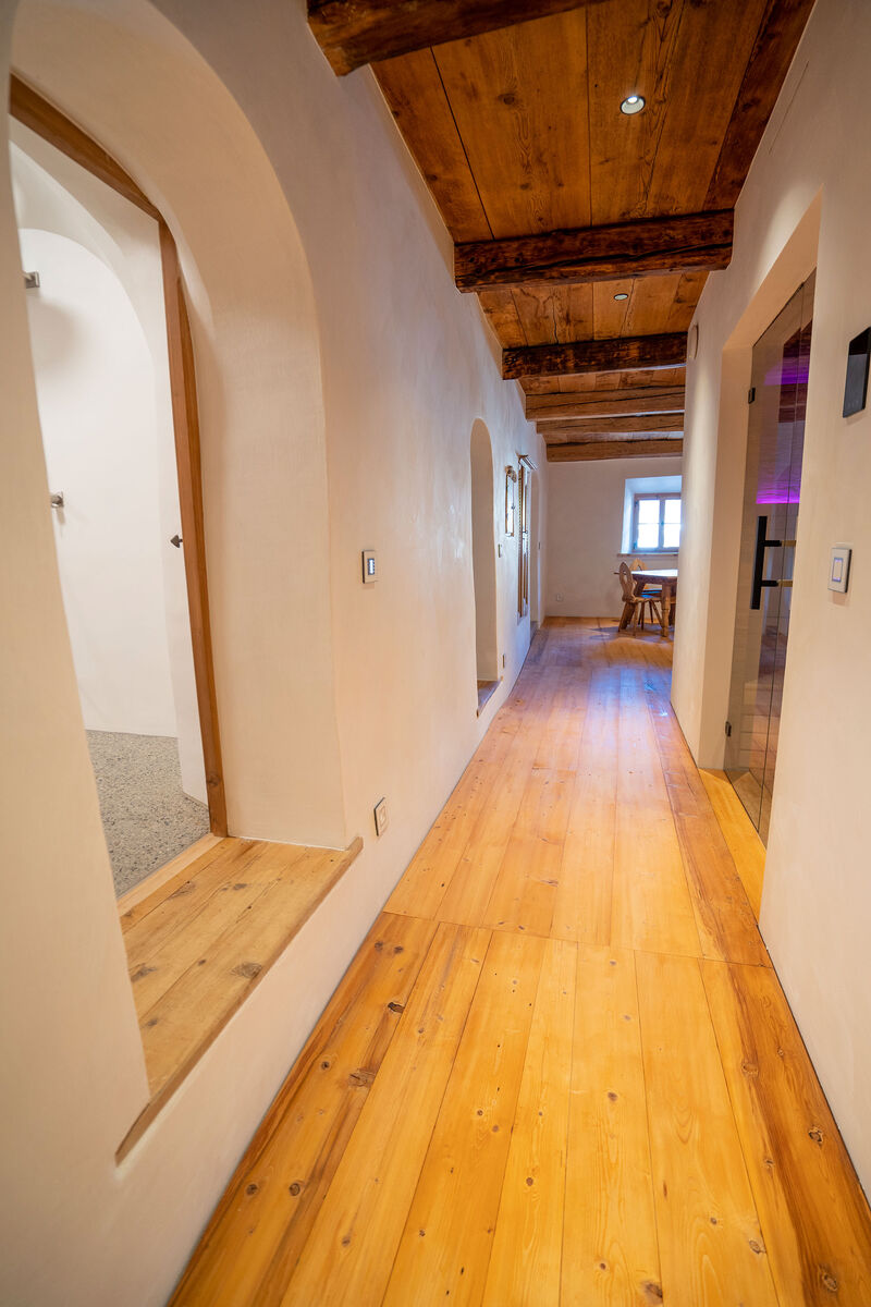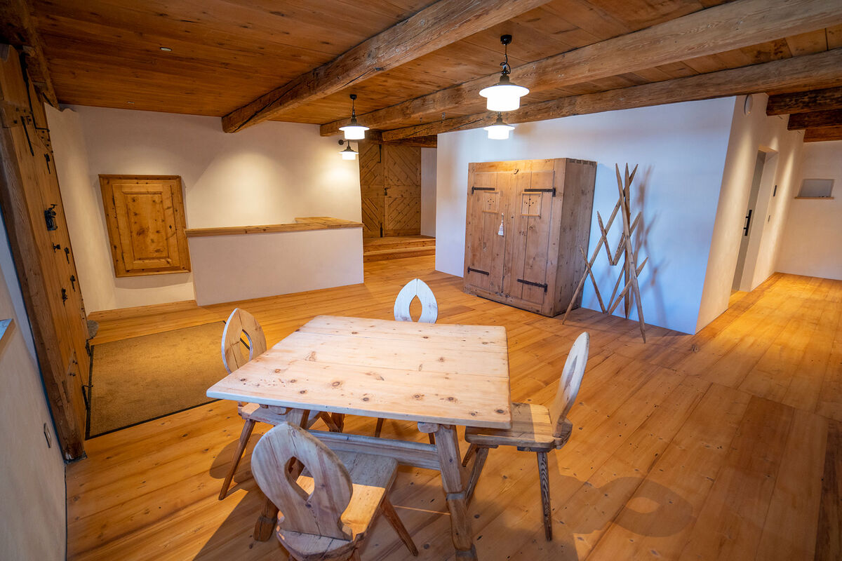 Die Raumstruktur wurde nur durch wenige gezielte und lesbare Eingriffe angepasst, so dass die Nutzung und die Raumbedürfnisse der Familie entsprochen werden können. So bleibt der Sulér offen als Eingangshalle und ist auch als Zwischenraum von Wohnraum und Aussenraum verstanden. Die Raumfolge (Stüva - Chadafö - Chaminada) wurde sorgfältig originalgetreu renoviert, so bleiben die historischen Kammern unseren Nachkommen original erhalten. Der Tablà (Heustall), das Herz der Anlage, wird zum Hauptraum. Von hier wird der Palantschin (Obergeschoss) mit den drei alten Schlafkammern erschlossen. Neu werden in den Zimmern zwei Nasszellen ergänzt, mit Bezug zum Stall und zum Himmel. Das Dach wird zum Kaltdach, so erhält die Liegenschaft auch ihre Lunge zurück.