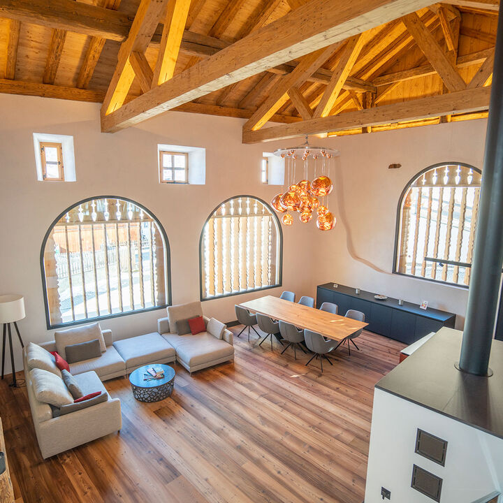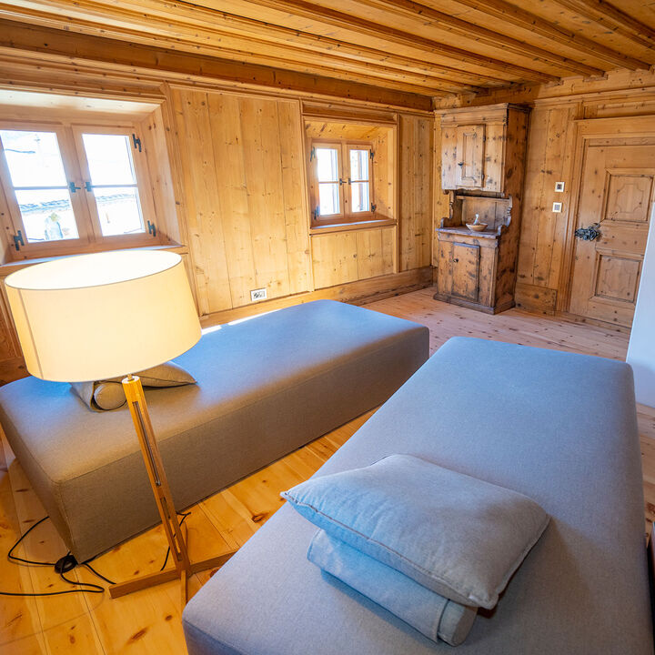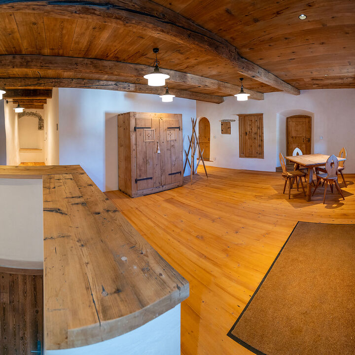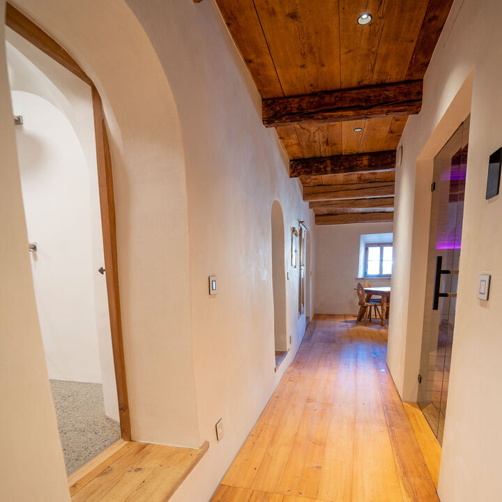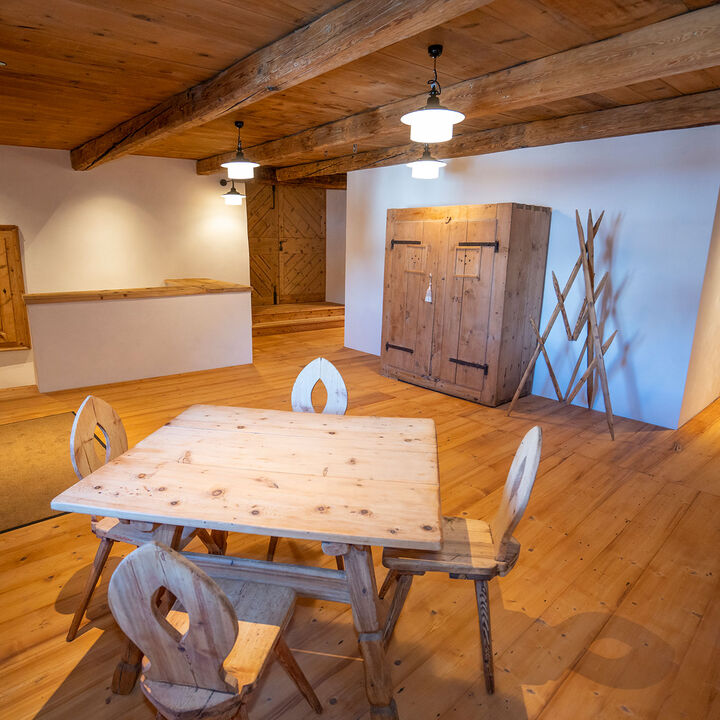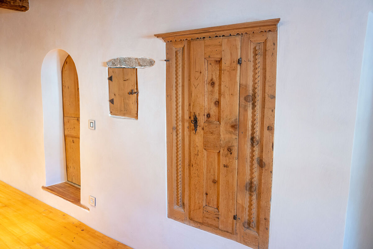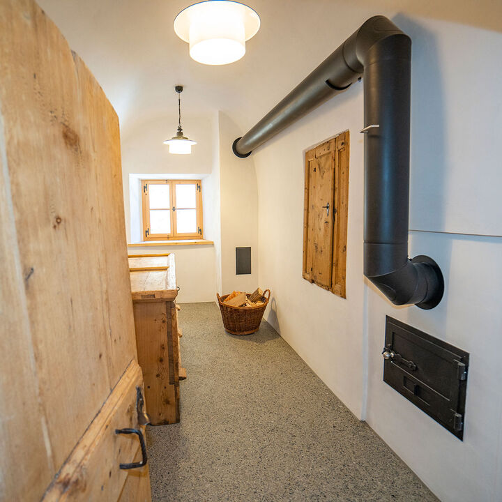 Die Raumstruktur wurde nur durch wenige gezielte und lesbare Eingriffe angepasst, so dass die Nutzung und die Raumbedürfnisse der Familie entsprochen werden können. So bleibt der Sulér offen als Eingangshalle und ist auch als Zwischenraum von Wohnraum und Aussenraum verstanden. Die Raumfolge (Stüva - Chadafö - Chaminada) wurde sorgfältig originalgetreu renoviert, so bleiben die historischen Kammern unseren Nachkommen original erhalten. Der Tablà (Heustall), das Herz der Anlage, wird zum Hauptraum. Von hier wird der Palantschin (Obergeschoss) mit den drei alten Schlafkammern erschlossen. Neu werden in den Zimmern zwei Nasszellen ergänzt, mit Bezug zum Stall und zum Himmel. Das Dach wird zum Kaltdach, so erhält die Liegenschaft auch ihre Lunge zurück.
