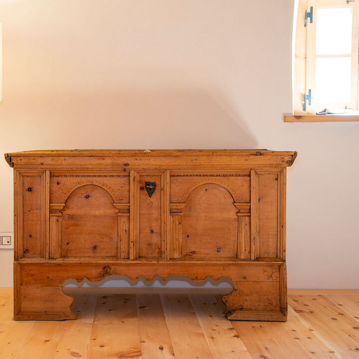 Die spezielle Wanddekoration mit den aufgemauerten Relief-Elementen wie die Ecklisenen, die Fenster- und die Toreinfassungen, stammen aus dem Jahre 1706. Genauso sind die farbig nachgefassten Beschriftungen und die Verzierungen in der Sgraffiti Technik in die Fassade gekratzt und stammen aus dieser Zeit.