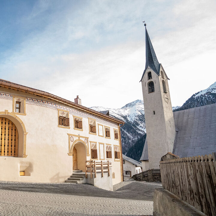 Das prominent gelegene Bauernhaus vor dem Hauptplatz zur Kirche stammt aus dem 17. Jahrhundert. Die Fundamente könnten teilweise auch älter sein. Stüva und Chambra weisen auf einen turmartigen mittelalterlichen Bauteil hin. Wie alle Bauernhäuser in Guarda steht auch dieses Engadinerhaus unter Denkmalschutz.