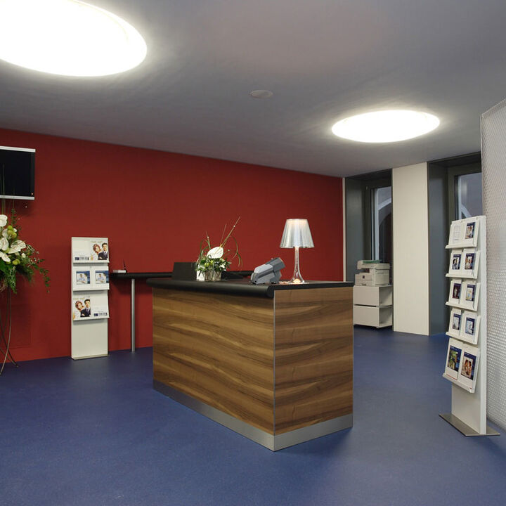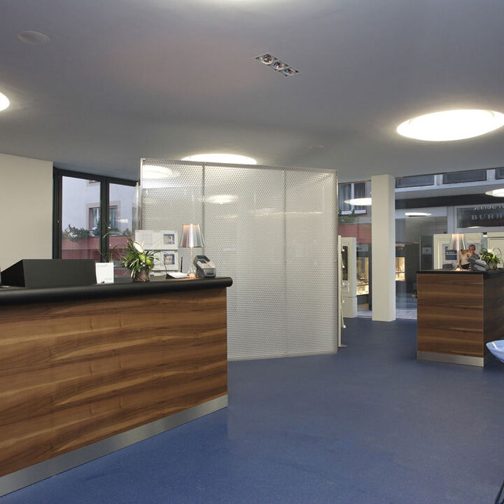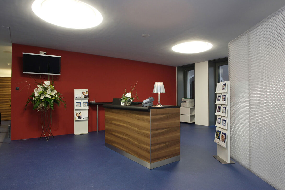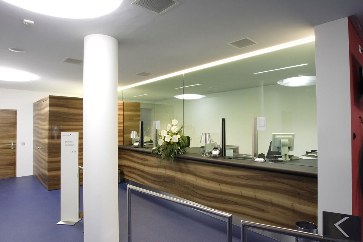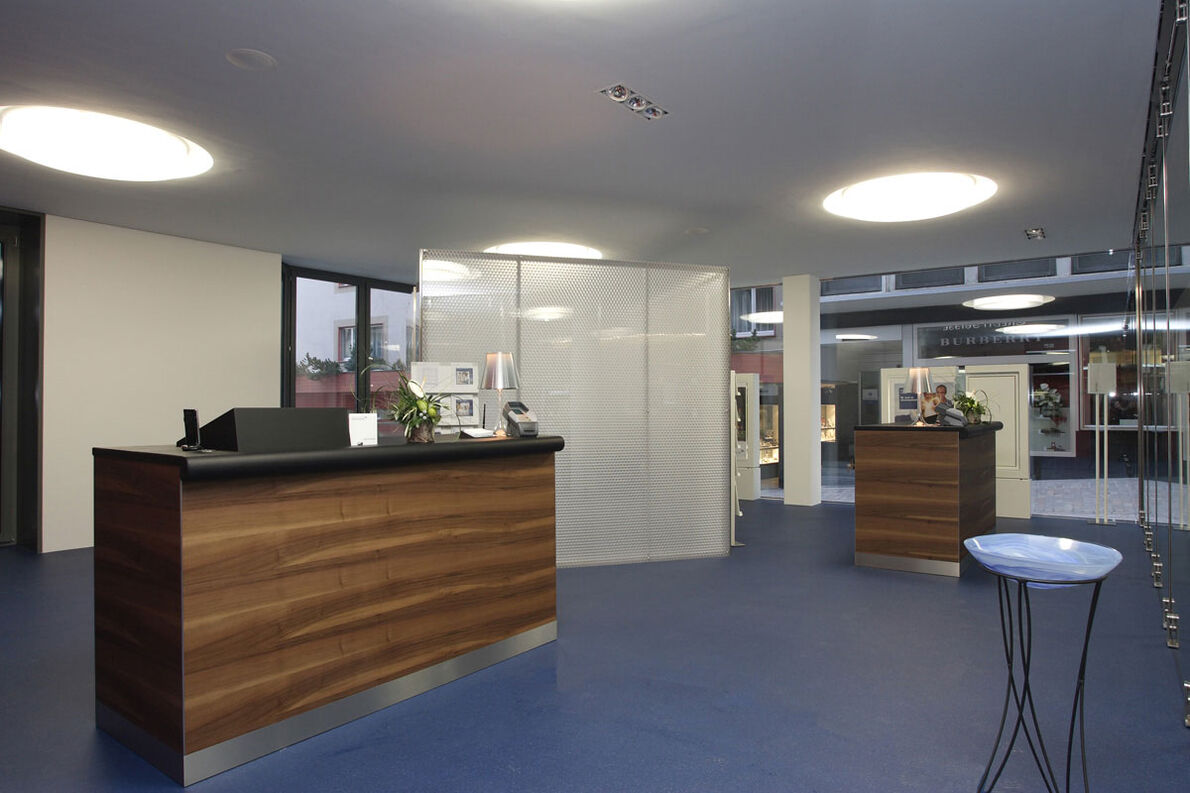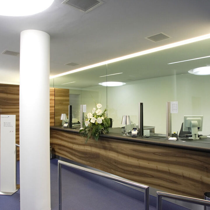 Die Eingangshalle ist hell, einladend und elegant gestaltet. Die Bankschalter liegen diskret zurückversetzt, für den Besucher erst auf den zweiten Blick erkennbar. Dadurch wird für die Kundschaft Diskretion und Sicherheit gewährleistet.