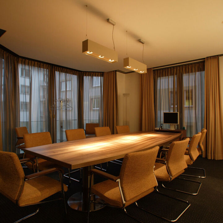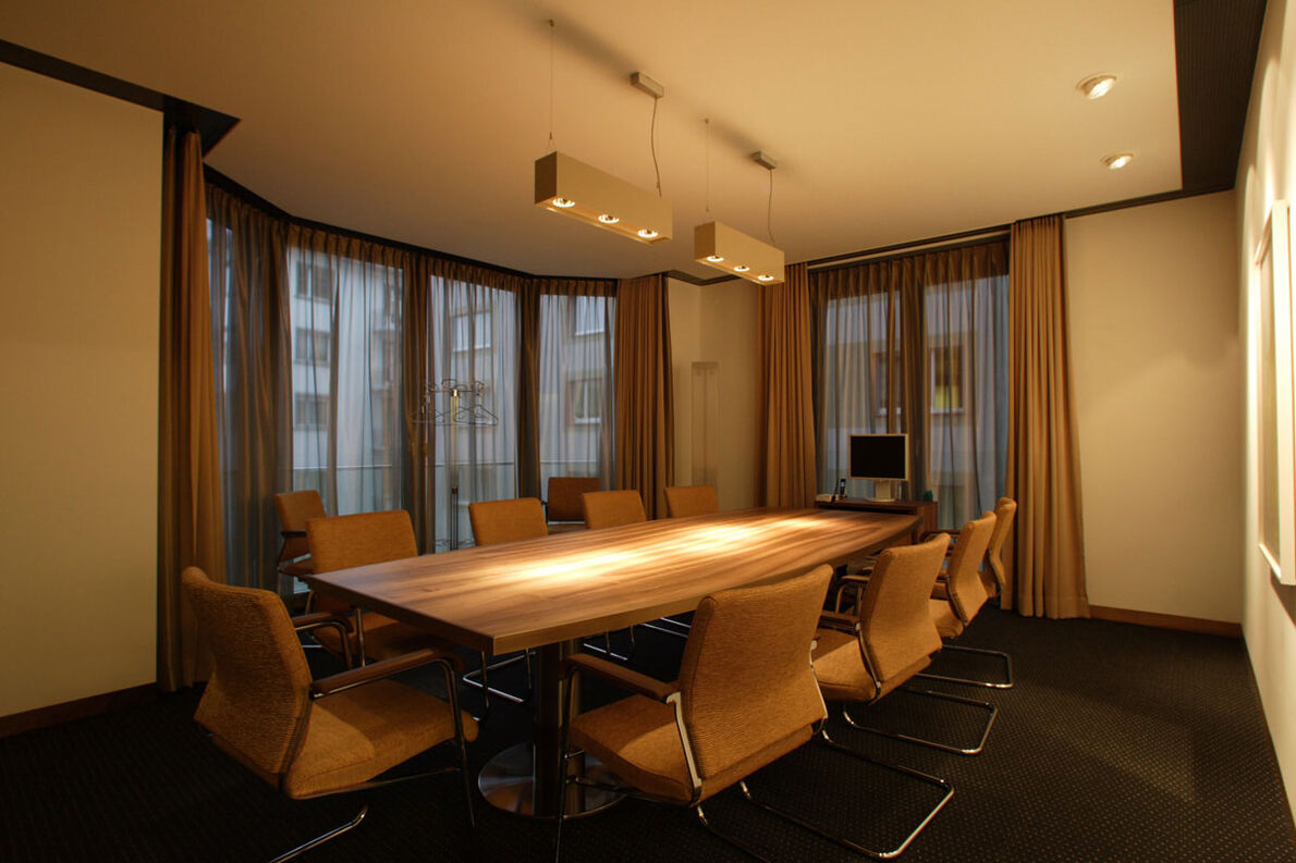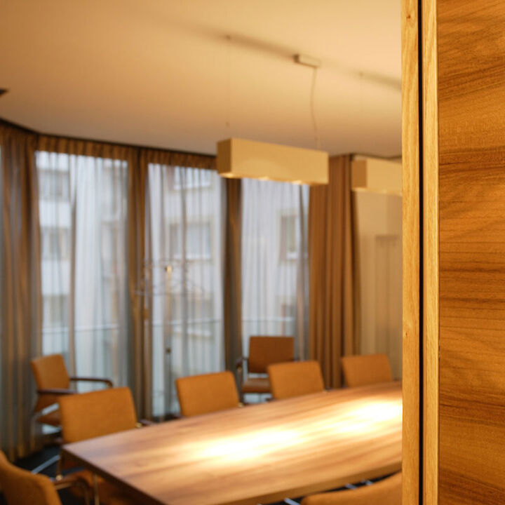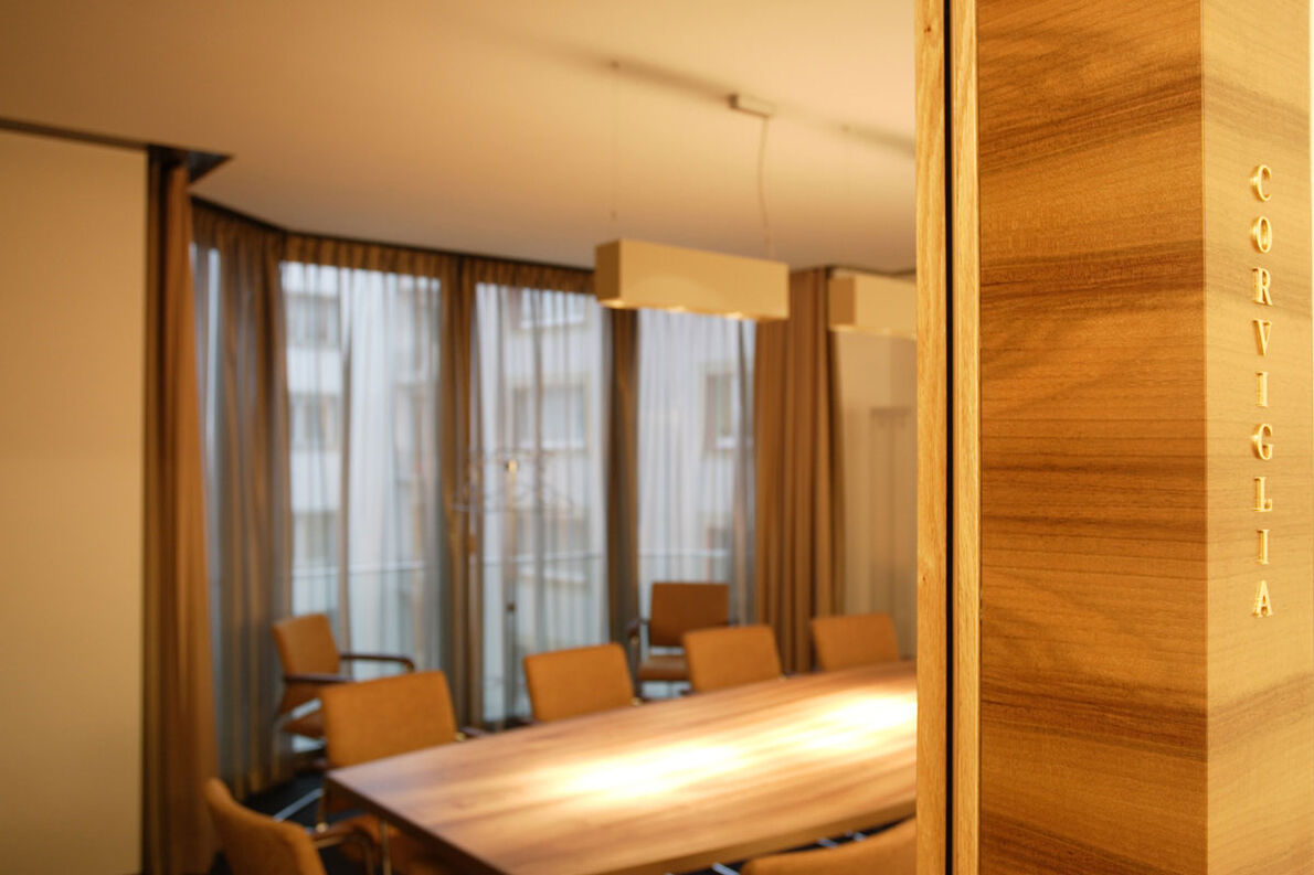 Die Besprechungszimmer präsentieren sich den Kundinnen und Kunden als speziell gestaltete Räume mit einer aussergewöhnlichen Goldwand, einer funkelnden, himmelblauen Gipsdecke, einem schwarz-goldenen Teppich und einer Tür aus Nussbaumholz.