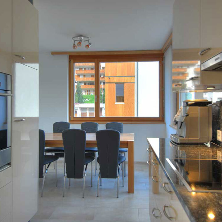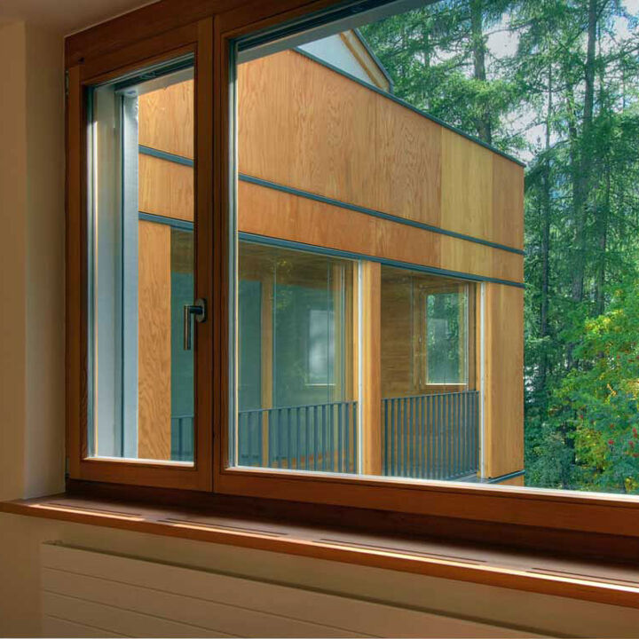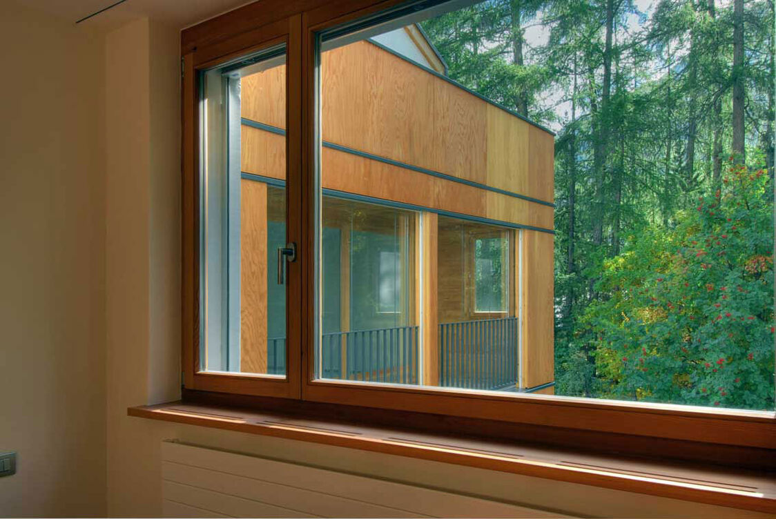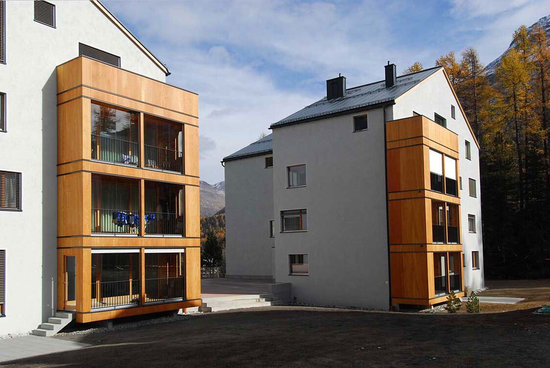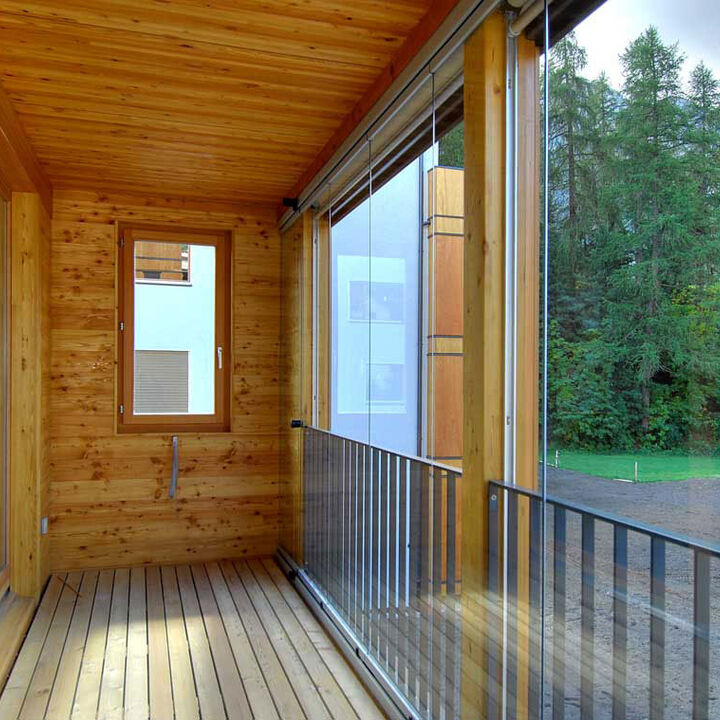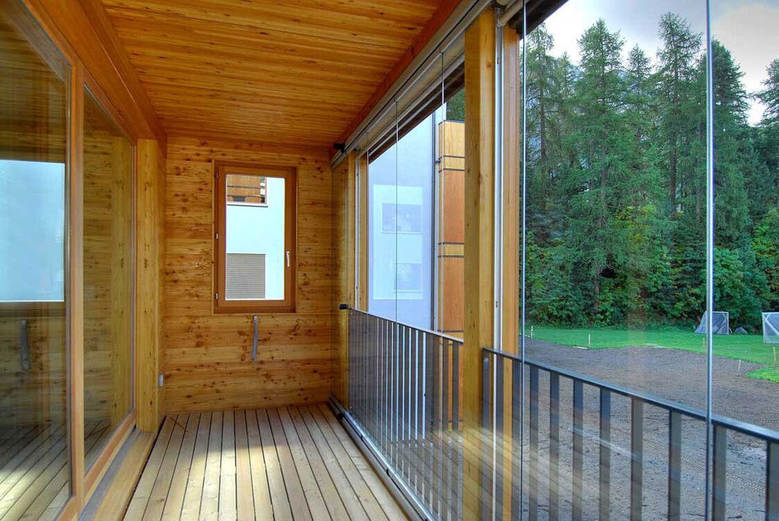 Die einfachverglasten, vom Hauptgebäude abgetrennten Holzveranden, schützen vor dem Malojawind und stellen somit eine effektive Wohnraumerweiterung dar. Die Holzveranden aus Lärchenholz bieten den Bewohnerinnen und Bewohnern in der kompakten Wohnüberbauung die nötige Privatsphäre im Aussenraum.