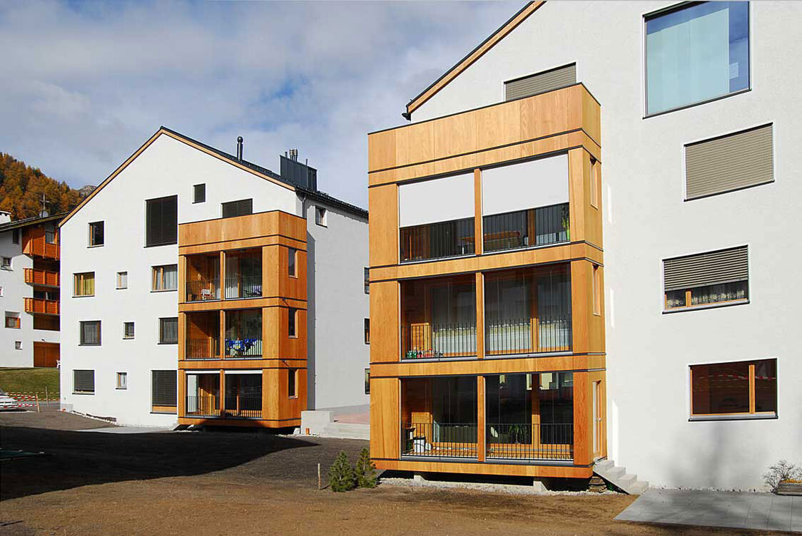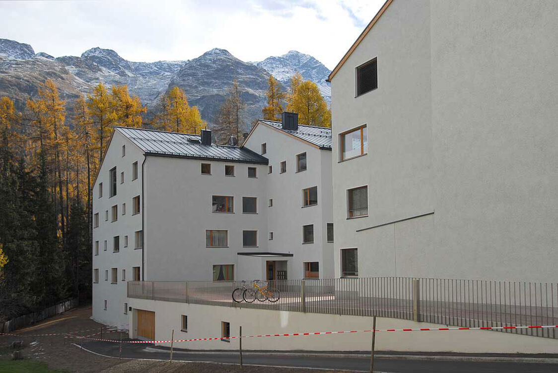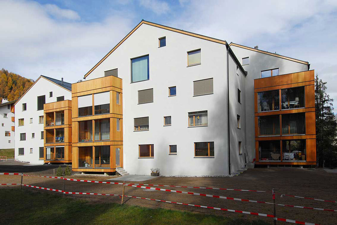 Die nach Minergiestandard realisierte Überbauung wird über einen gemeinsamen Platz respektive eine Aussichtsterrasse mit Blick auf den St. Moritzer-See erschlossen. Unter der Terrasse befinden sich die Autoeinstellplätze. Jedes Haus kennzeichnet sich durch grosszügige Nebenräume mit einem Keller und einer Waschküche pro Wohnung.